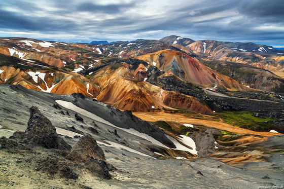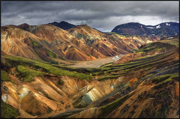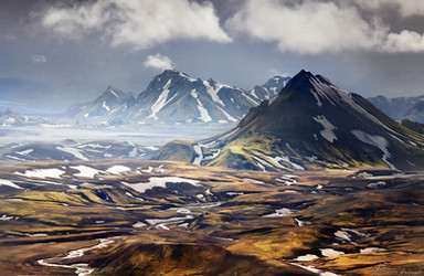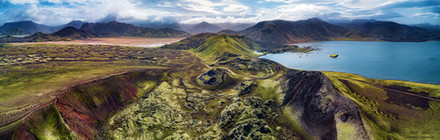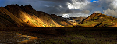 This scene is what greets the hiker walking on the Laugavegur trail's 2nd day. After the first day of walking through fumaroles and rhyolite mountains, passing one ridge after another, this final one leads to one of the most incredible scenes I can remember. It's cliche to say that it reminds me of Rohan, but I can't think of a more suitable place other than perhaps in New Zealand where the movies were actually filmed. This pano suffers from quite a few imperfections regarding lens flare but for the purpose of sharing a grand scene, I think that is less important. I hope this image gives you at least some sense of the wonder Marianne and I did as we sat there and enjoyed our lunch break before descending to the river crossing before reaching Alftavatn hut (at the lake visible in the scene)