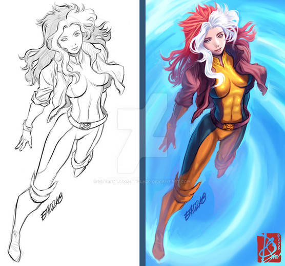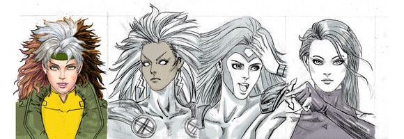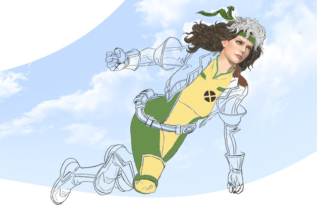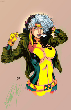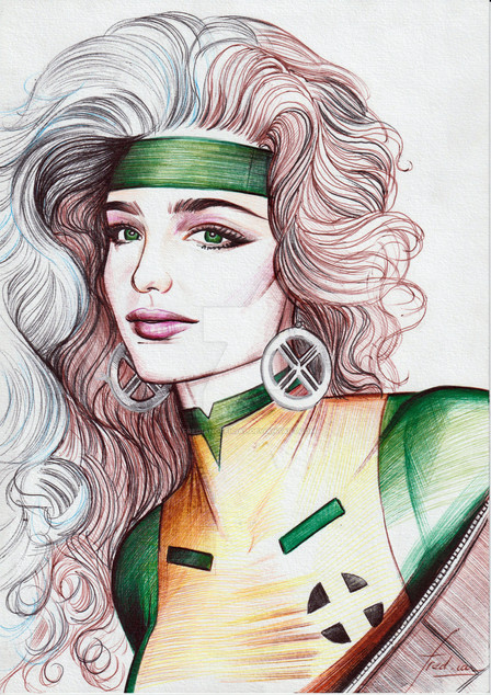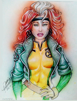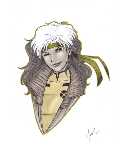 Rogue sketch card commission. 85% complete. A bit more tonight. Pencil art measures 2.5" x 3.5". Scanned and painted at 300dpi CMYK Photoshop. This piece started before I learned some new skills at a digital painting class. So you will see the hair is kind of my old style of painting and the jacket is the new blending method I learned.Related content