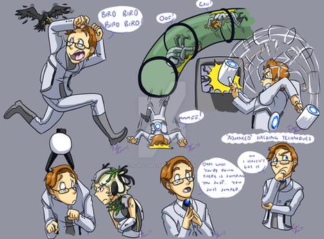 Now here's an adorable concept. A miniature GLaDOS would make for an interesting companion. Is her tail/extension cord thing going through a portal? I especially like the drawing on the top left where Chell (?) is cleaning her with the air spray can (or so I'm guessing).Ā