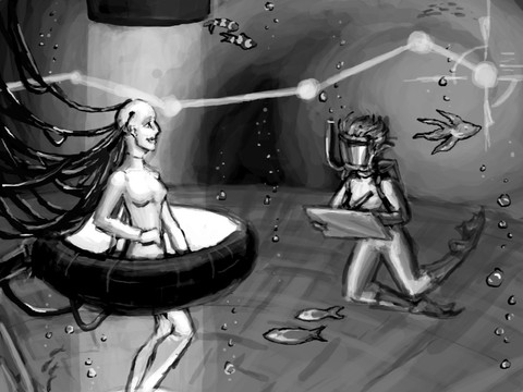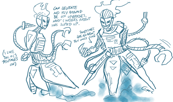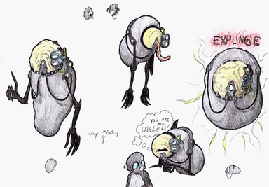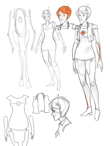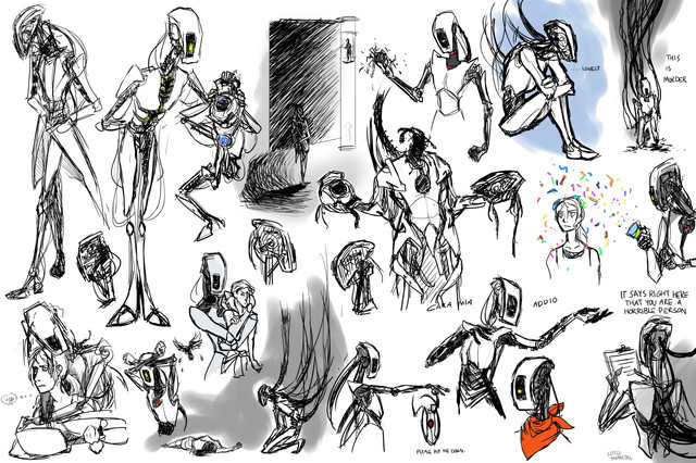 I did say I'd dump the doodles I used to come to the final GLaDOS piece I just submitted, so here they are.I may or may not scrap this mess later. It's much sketchier than the earlier piece, but you can see where I got Upside Down GLaDOS from.