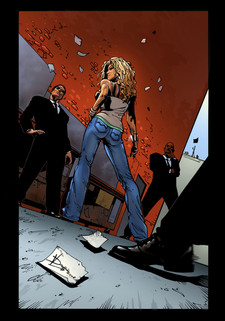 Very nice action scene. I like how it looks as though she's driving right through the final pane.