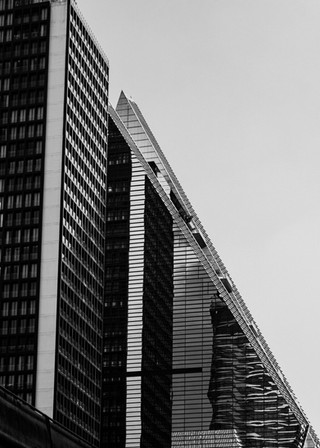 Shot between two buildings you can see the building nicknamed 'The Cheesegrater' (the one with the X's). Found at 122 Leadenhall Street, London, also known as the Leadenhall Building, 225 metres (738 ft) tall. It opened in July 2014 and was designed by Rogers Stirk Harbour + Partners; it is known informally as The Cheesegrater because of its distinctive wedge shape (which tapers at an angle of 10 degrees) similar to that of the kitchen utensil with the same name.