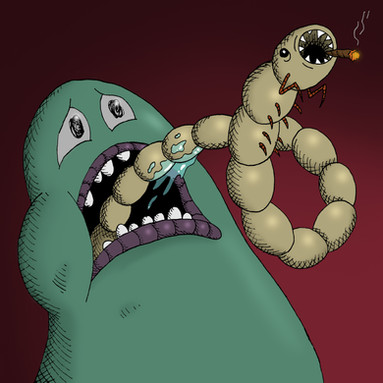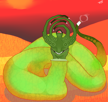 Dimnes are quite strange creatures. They look like some kind of praying mantis with a human head, but without mouth. Instead of that, they have TWO mouths, both at the end of their mandibules.Dimnes are faster than light, and therefore are fearsome predators.