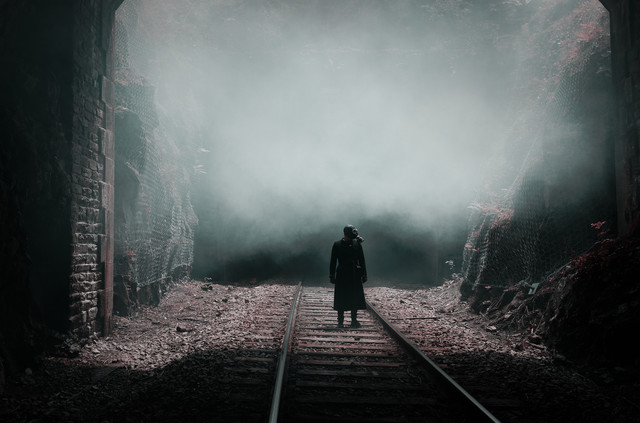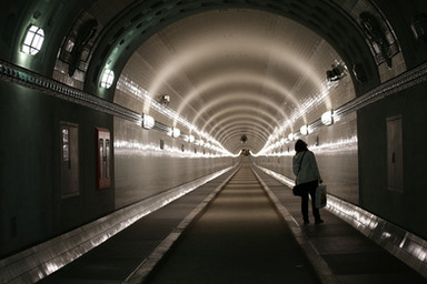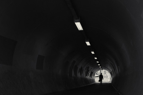 Reminds me of a futuristic dystopian. I like how there's one lone figure at the end of the tunnel.