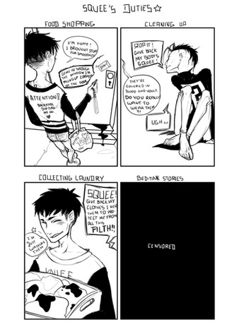 Squee grew out of being afraid of his scary neighbour-man and into knowing that he wonβt get hurt (too badly) while close to him.So he is close to him often. As close as his teenage libido wants him to be.