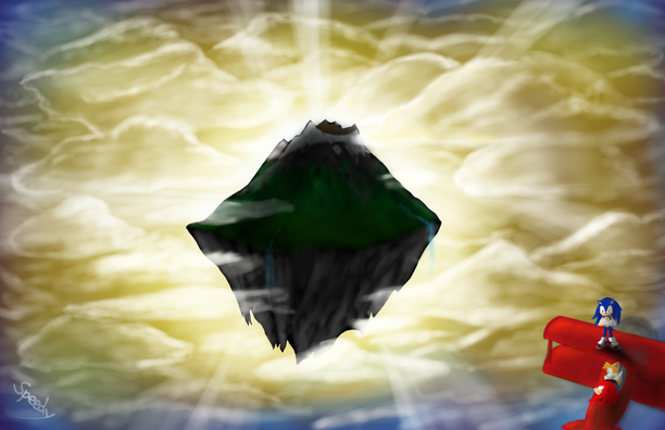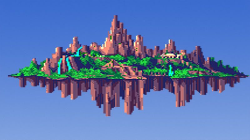 It's pretty good. From a distance it looks the same as in game (by memory). Love the incorporation of the pyramids. Is that a Marble Zone top or Sky Sanctuary building? Thinking Sky Sanctuary. Guess that's ice cape zone on the left side of the image, wrapping around to the other side of the mountain. Looks funny where the greenery suddenly cuts off and turns into the rocky outcrop of the underside of the straight of an edge. Too ... linear. Got to make it look like foliage is hanging over and stuff. Looks too sharp and straight.