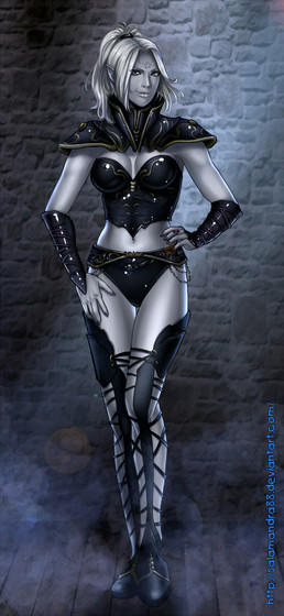 very nice piece.. i love the color-matching of the armor and cape, with her purple-ish skin