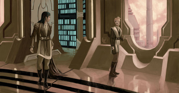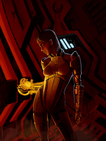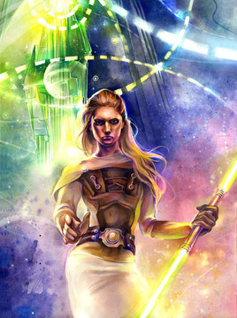 I love the darkness and red lighting of this one. The architecture of the ship is awesomeβthe windows are so very dramatic and menacing, and I like how much you demonstrate about her character in the composition of the background. I think I would have liked it simpler, though. The fleet of Star Destroyers in is a bit distracting.