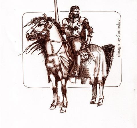 Knight, sword, black horse, great costum etc