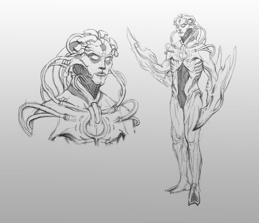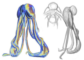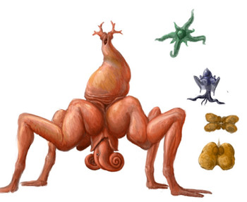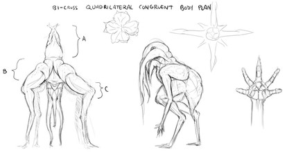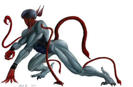 This particular robot has the standard FOUR ARM THREE LEG TORSO ABOVE HP CONGRUENT SPINE body plan, somewhat similar to a human except for the extra limbs. It has nine eyes, a mouth to consume food for nutrition, a nose, ears, some whiskers, and long tenticles that trailed from the back of its head incase its body was totally destroyed, this way it's brain could escape and survive.