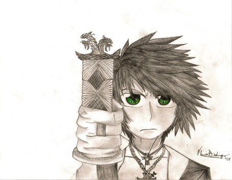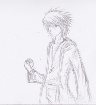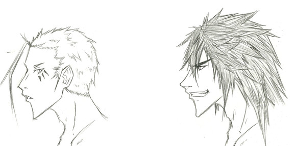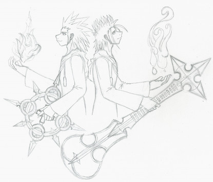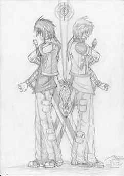 Draco and Hulsen again, this time in .5 Mechanical Pencil. I drew them both using their own powers, Hulsen's dark fire and Draco's light, and just drew them back to back with their swords. That's about it for stating the obvious. I like Hulsen's face.So yeah. Enjoy.