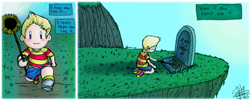 Very nice picture of Lucas. It's very sweet and touching. Very true message, I've got to get around to playing this so I can fully understand the impact of the message. I have been playing a lot of Earthbound/Mother 2 and some hacks of it, so I should give Mother 3 another shot.