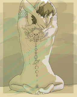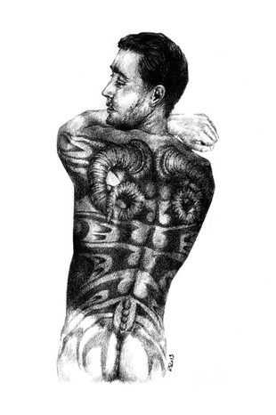 Le cancer... Les natifs de ce signes sont considérés comme rêveurs, sensibles et romantiques. Il me semblait donc intéressant de travailler dans cette optique là. D'où ce choix d'un corps nu, pur et lavé de tout a priori... Après, je me suis aussi amusée à apporter quelques signes poissonneux à cet homme, histoire de rappeler qu'il vient bien des océans ^^.
