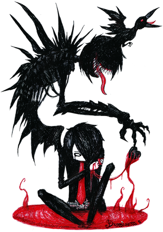 Like the contrast in personality here between the playful yet self-consciousness of Kraven alongside the cool, relaxed profile of Ayce herself. The juxtaposition of your main elements (striped tentacles, skeletal motifs, et al.) only further your brand of dark fantasy recognizable yet fresh. Keep it up!
