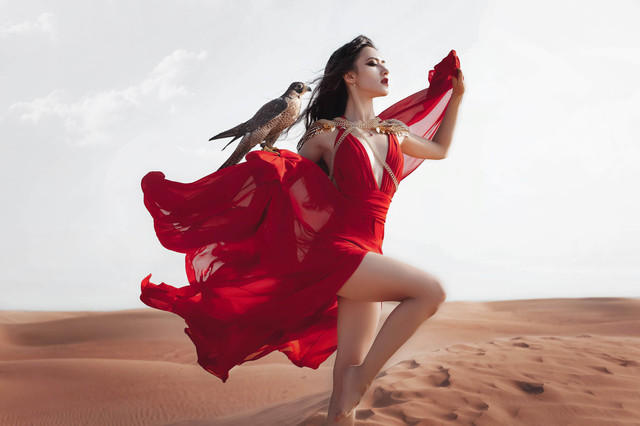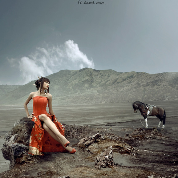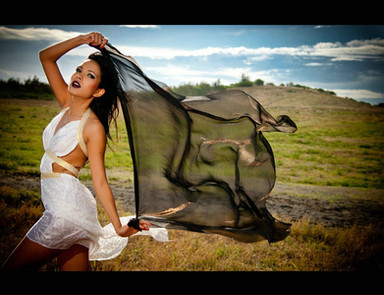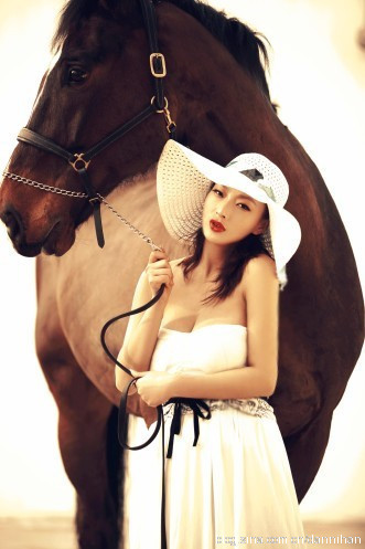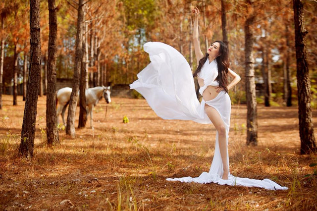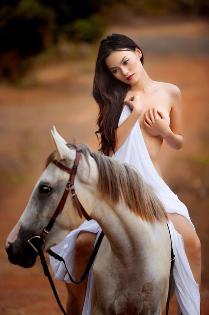 The contrasts throughout this picture is eye catching. The black hair against the white sheet. Pick a boo sensuality. The model risen in the air while the white horse bends its head down. Love it.