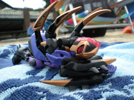 That's the idea! They're right above a sewage runoff, and Bumblebee doesn't want to fall in and get stinky. But he was fine, 'cause 1, he's got that part of the front windshield on the back of his leg, giving him balance. And 2, he's got like, a bulkier kindof build, making him a little heavier. But it was PROWL that I was worried about! He's like a freakin' stick! He'll fall over from the slightest breeze! And than I would lose him for ever!