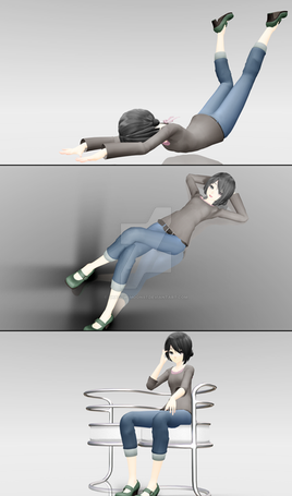 "Idunno. Maybe people are into it. I'm kind of flexible, myself, actually." Julia twists her torso 180 degrees by holding the back of the chair and locking her legs to the chair beneath her.