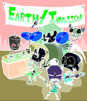 A Invader Zim Band??? I was wondering what it would look like and here it is! Zim is the lead singer, Dib on guitar(he's so cute looking), Tak on bass, Gaz on drums, Gir on the turn table and MiniMoose is playing the tamberine. I was going to put Skooge in the bottom left corner but I was just too lazy. He was going to be their biggest fan(heh, get it?)I was listening to The Anthem by Good Charolete when I drew this so it looks like that's what their playing.