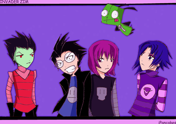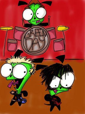 A Invader Zim Band??? I was wondering what it would look like and here it is! Zim is the lead singer, Dib on guitar(he's so cute looking), Tak on bass, Gaz on drums, Gir on the turn table and MiniMoose is playing the tamberine. I was going to put Skooge in the bottom left corner but I was just too lazy. He was going to be their biggest fan(heh, get it?)I was listening to The Anthem by Good Charolete when I drew this so it looks like that's what their playing.