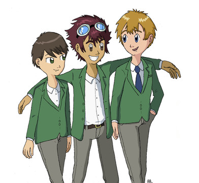 During the summer arc in 02, Taichi and Sora wear matching T-shirts - Taichi wears a shirt saying Triangle, and Sora wears a shirt saying Circle. But that's only two basic shapes! What of the last one, Square?Well, I think it’s probably in Yamato’s closet. Deep, deep inside Yamato’s closet.