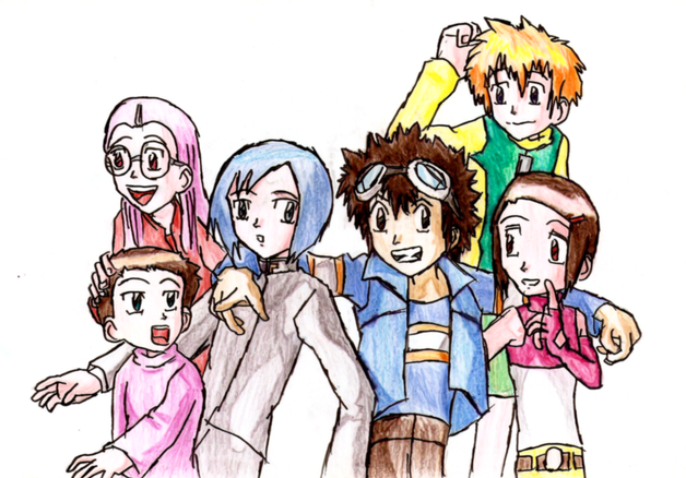 This is RIDICULOUSLY LATE (August 1st was like eight days ago, man), and it looks a bit like crap, but DUDE I FIT EIGHT PEOPLE INTO A PICTURE HAHAH I'M AWESOME. Also, PRETTY COLORS. Also... also I worked my ass off on this thing, like seven hours total. So dude.Anyways. August 1st was the NINTH anniversary of the events of Digimon Adventure. It's nice to have concrete dates like that. So these are the eight original Chosen Children all grown up. Hah. Taichi and Yamato would actually be my age now, that's kind of creepy. (Sora's about five months younger than I am, she's a February/March 1989 kid.) ...speaking of creepy, Iori would be in his third year of middle school now. Yes, that's a 02 thing, but it's still Adventure and it's still CREEPY.