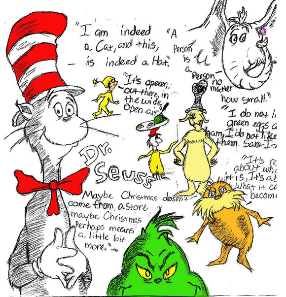 This is part of my final for Fine Arts. After a few good weeks of working on it, it's finished. I chose Dr. Seuss for the fun of it. Here are all the characters starting from the right:Thing 1, Thing 2, Fish/Krinklebine, Sally, Conrad, Cat in the Hat, Max, Cindy Lou Who, Grinch, Unknown(guy who is chased by Sam), Sam-I-Am, me, McGillicuddy, Pontoffel Pock, Neefa Feefa, The Magic Flying Piano, Hop on Pop children, Fox in Socks, Yertle Turtles, Star Belly Sneetch, No Star Sneetch, Oh, the Place's You'll Go child, Gertrude Mcfuzz, Wickershame Brothers, Sour Kangaroo, Once-ler, Lorax, Truffla Tree, Vlad, Mayzie, Horton, egg, clover, Mayor, and Jojo.