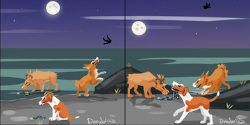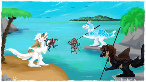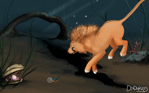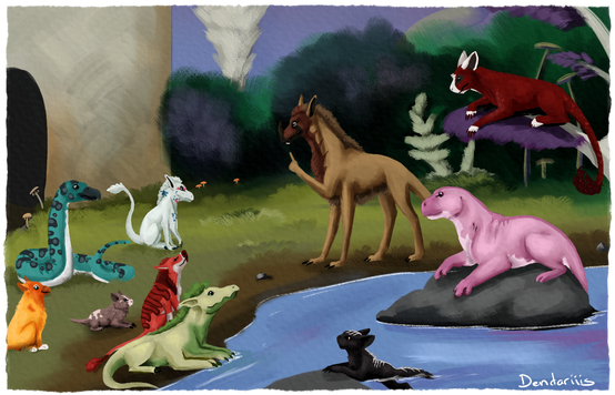 He stands there frozen until the hunters who had stopped just ahead to discuss plans turn and realize he is there. His father wades towards him and lifts him from the mound where he stands, flib leaps to perch on the older okcovjeks tail, "It is beautiful, is it not Skryvn?" Skryvn nods, and listens as his father talks about the moon. The other hunters pat his head as they depart, smiling to themselves as they see the trophy young Skryvn has appropriated for himself. The hunter to whom the trophy belongs nods his approval and states it suites him well before moving on with the others. Skryvns father sits him down along the edge of the waters, and talks to him of all the animals sounds they hear, and of the animals who happen to pass by them, and Skryvn is soon lulled to sleep listening to the rumbles of his fathers mind speech and the melody of the swamp.