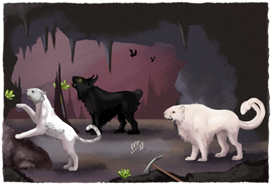 Once his mother leaves his sight he scampers out of the cavern and into the exit tunnel he'd seen the others go down, his young zipmuck Flib at his heals. Near the tunnels exit, he sees some of the previous hunts trophy's drying out on a rack, flib sniffs them curiously. Skryvn spots some linen and upon picking it up wraps his waist the way he'd seen the older hunters do it when they wanted to wear one of their trophy's on their waist. He reaches for a dried up bird skull and hesitates, he can see a bit of crust inside that hasn't been scraped yet, but he is a big boy, and he will wear a skull too! With a shaky hand he threads a piece of linen through the back of the skull and ties it to his wrap. Now very pleased with himself he moves on.