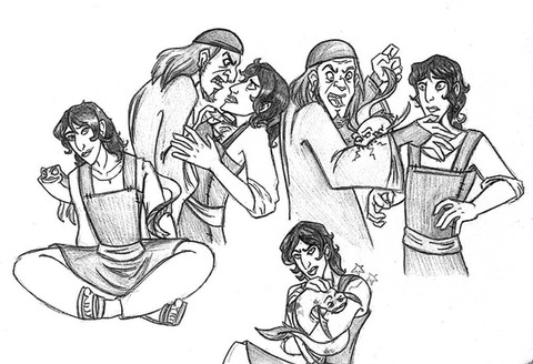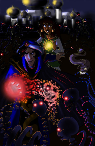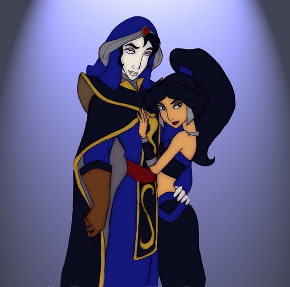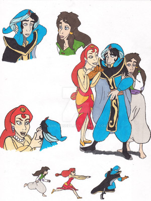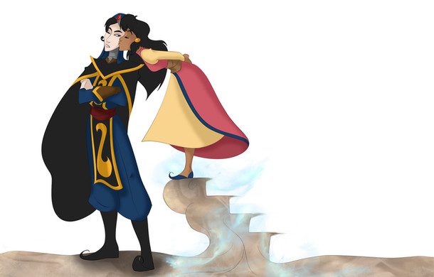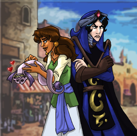 So, more Moze x Sadira. Don't know why I am drawing these two so much. They just grow on me. ^_^ I wanted to draw Mozenrath being a smarmy bastard. Aladdin and co just showed up and are hanging out like "Dafuq?"Borrowed and altered the bg from 'Tales of Agrabah, ch 7", a Disney illustrated storybook. I am so friggin' lazy with backgrounds. XD;