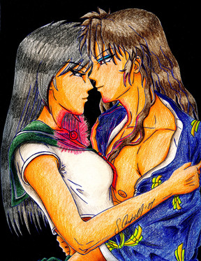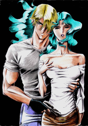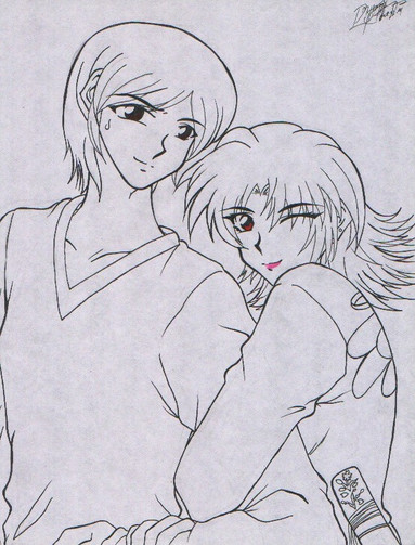 I just saw the top of the guy's head and guessed it was Hyoga . It means that you managed to keep his characteristics although you drew with your own style ! I don't know RE very well but the girl looks very pretty and goes well with our dear Hyoga.. Very beautiful drawing