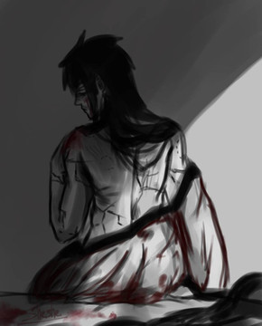 To me it seems he's been through a lot. Abused, probably tortued in terrible ways, he just wants to end it all. I like it by the way, and I have to third Lidsworth's comment. But as you said, it's left up to viewers.