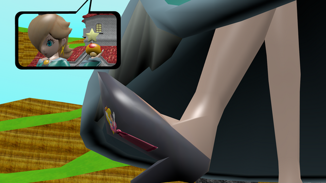 A pair of giant heels landed hard on top of her, instantly flattening the unaware princess into a pancake. The speed that Rosalina had gathered from launching herself from such a long distance increased the force of her landing tenfold, which in turn made Daisy extra flat. Not to mention Rosalina was over twice her size. The intense weight and impact turned the flower princess into an extremely thin yellow layer under Rosalina's heels.