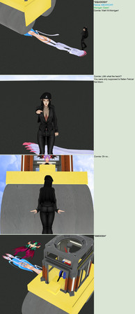 Connie was out on a trip to the paper printing factory. With all of the chaos she was normally involved in, she decided to take a day off, and perhaps educate herself a bit on the city life. She wasn't even sure herself why she chose to visit the paper factory, but here she was.Connie stood atop a catwalk over the large, bustling factory filled with various machines that did who knows what. She peered over the railing and saw all the machines going to work. Conveyor belts, presses, rollers, cogs and gears, everything. Intrigued by the huge machines, she bent over the railing to get a closer look. However, her curiosity got the best of her, as Connie leaned to far and fell over the bar into the factory below.