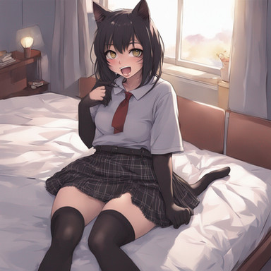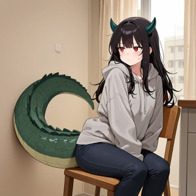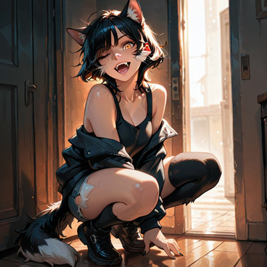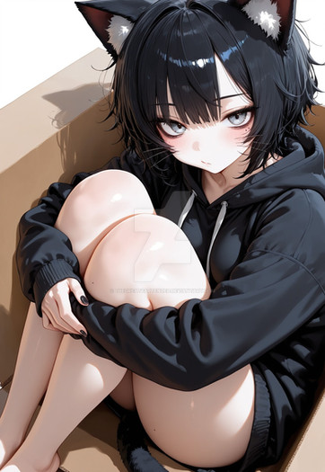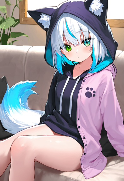 #digitalart #fanart #blush #eyepatch #fang #full_body #gloves #hood #hoodie #indoors #loafers #shoes #standing #tail #black_hair #brown_eyes #aiart #long_sleeves #open_mouth #no_pants #black_gloves #hand_up #kemonofriends #medical_eyepatch #hood_down #extra_ears #brown_footwear