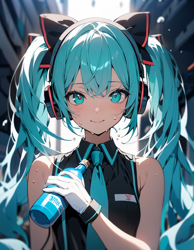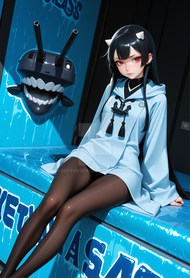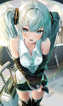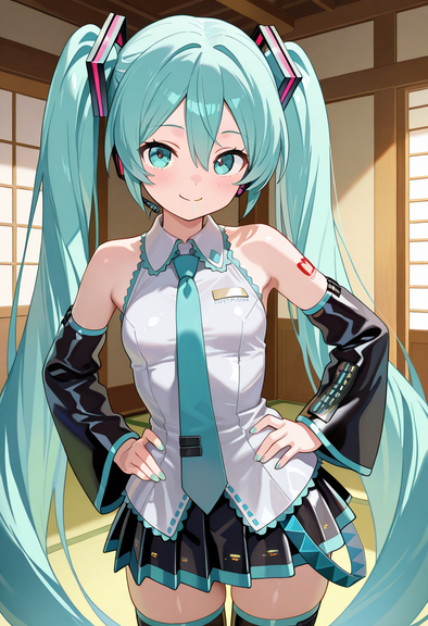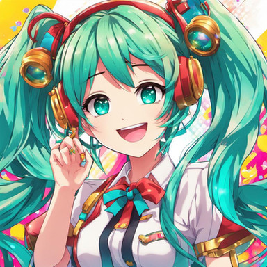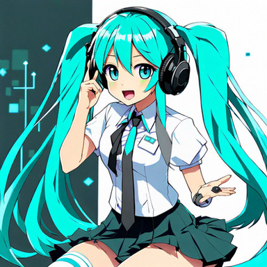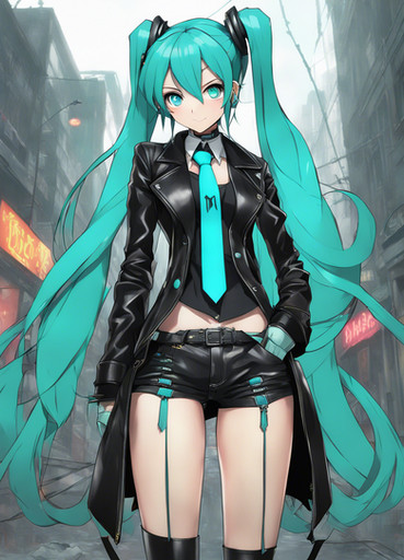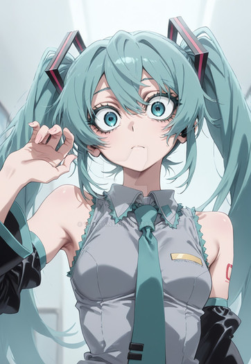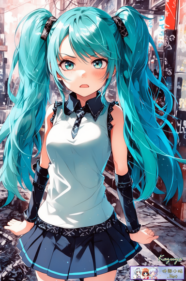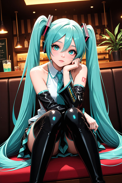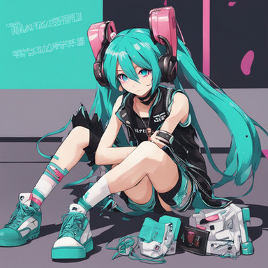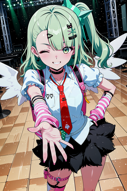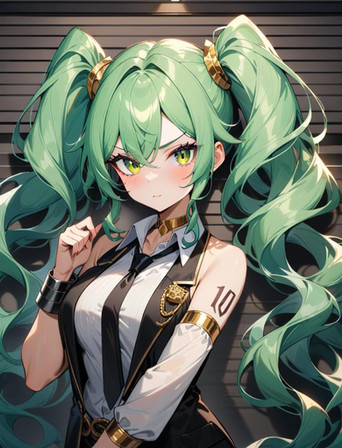 #fanart #digitalart #armband #eyeshadow #gloves #long_hair #makeup #necktie #pantyhose #sitting #skirt #socks #surprised #twintails #green_hair #aiart #long_sleeves #open_mouth #multicolored_hair #very_long_hair #safety_pin #hair_ornament #streaked_hair #projectvoltage #white_gloves #hair_between_eyes #white_necktie #green_armband