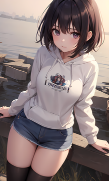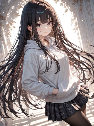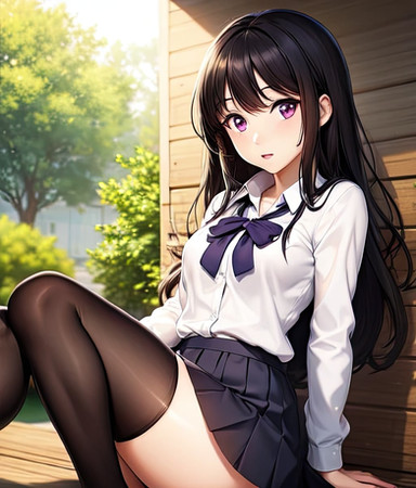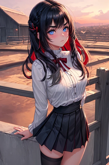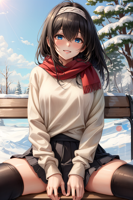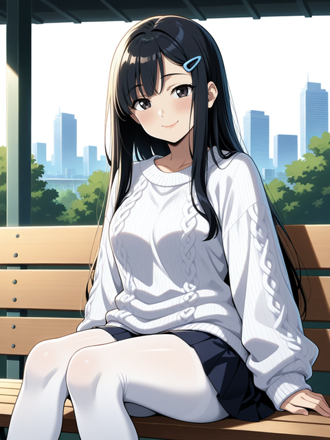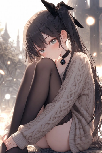 #digitalart #fanart #blurry #kneeling #long_hair #outdoors #pantyhose #rooftop #skirt #sunset #sweater #turtleneck #red_eyes #black_hair #aiart #looking_at_viewer #long_sleeves #turtleneck_sweater #closed_mouth #no_shoes #pleated_skirt #blurry_background #white_skirt #white_sweater #cable_knit #azur_lane #aran_sweater