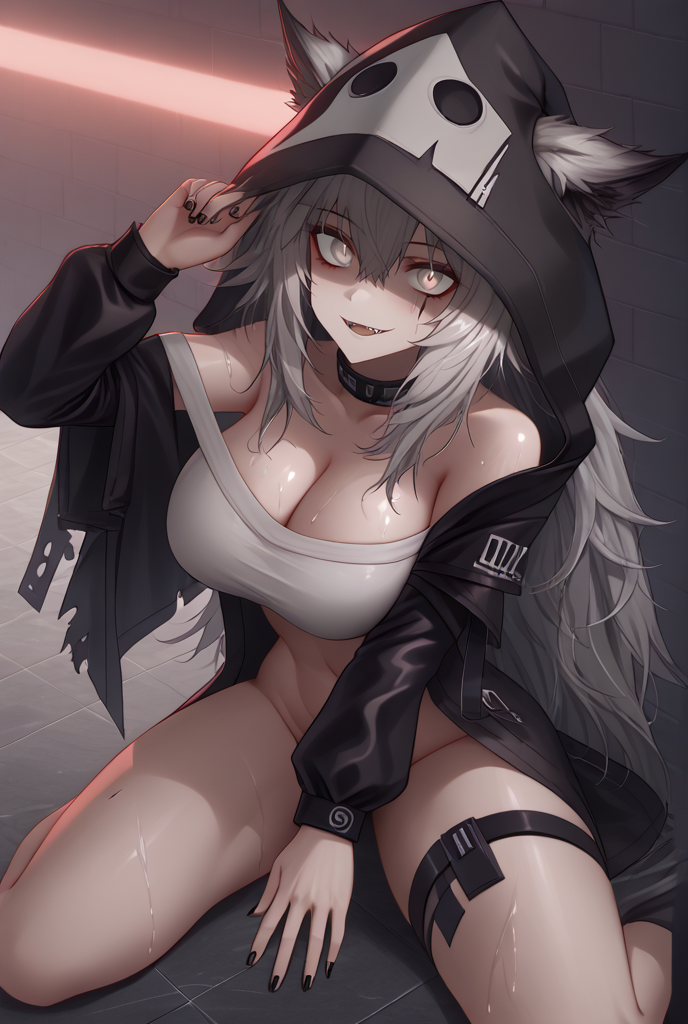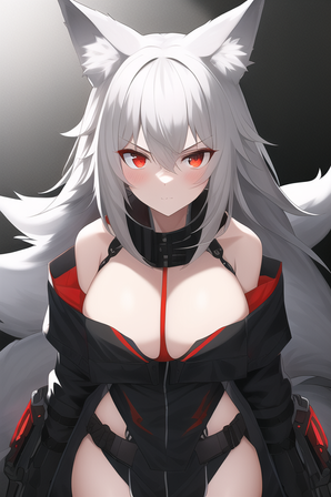 #fanart #digitalart #collarbone #jacket #nipples #see #shirt #tail #thighhighs #through #animal_ears #fur_trim #aiart #wolf_girl #red_jacket #wolf_ears #grey_hair #white_shirt #closed_mouth #open_jacket #no_bra #collared_shirt #wolf_tail #covered_nipples #open_clothes #cowboy_shot #medium_breasts #hair_between_eyes #partially_unbuttoned #red_thighhighs