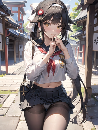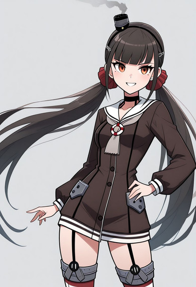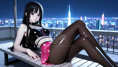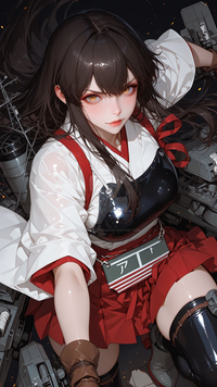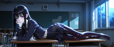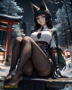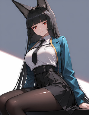 #digitalart #fanart #hood #horns #long_hair #pantyhose #piercing #sitting #red_eyes #black_hair #aiart #looking_at_viewer #long_sleeves #kantaicollection #hood_down #black_pantyhose