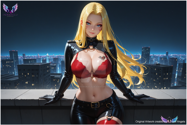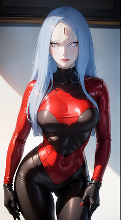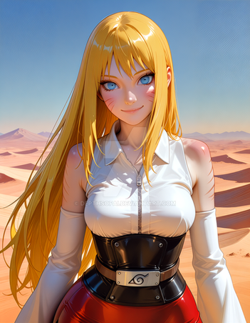 #fanart #digitalart #naruto #bodysuit #city #cityscape #kimono #latex #lips #long_hair #makeup #sunset #wallpaper #aiart #blonde_hair #looking_at_viewer #japanese_clothes #large_breasts #facial_mark #forehead_mark #short_eyebrows #mature_female
