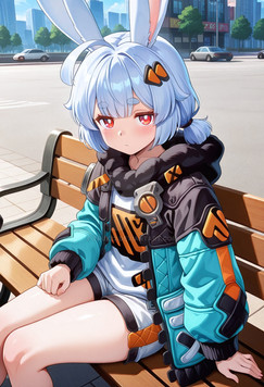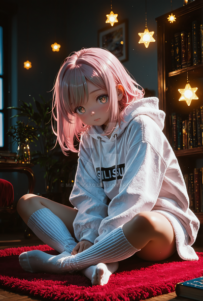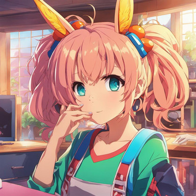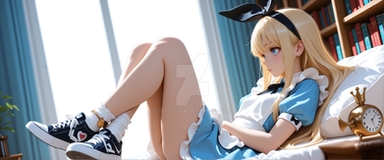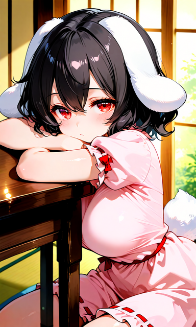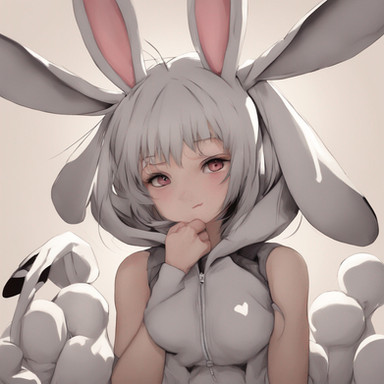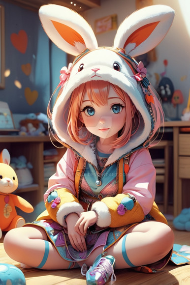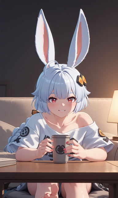 #digitalart #fanart #chair #cup #desk #disgaea #hairband #hood #indoors #mug #sitting #socks #steam #tail #window #red_eyes #animal_ears #aiart #blonde_hair #looking_at_viewer #pointy_ears #short_hair #rabbit_ears #white_socks #slit_pupils #fake_animal_ears #hood_down #black_hairband