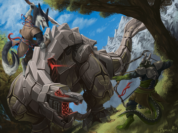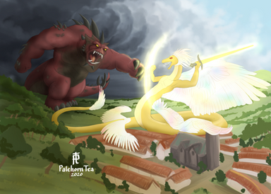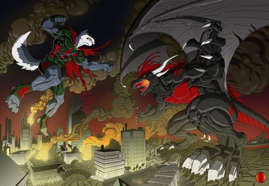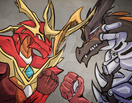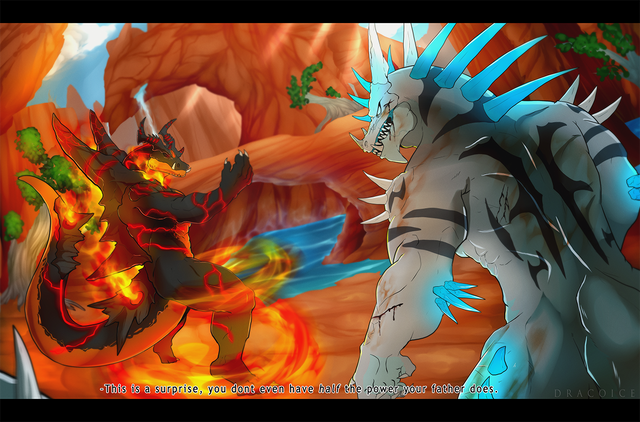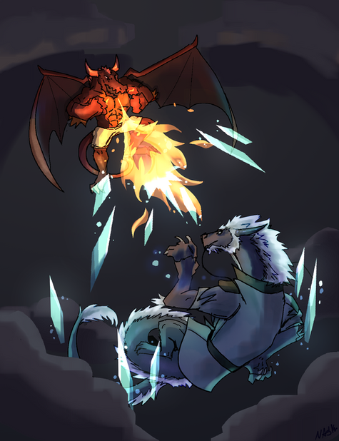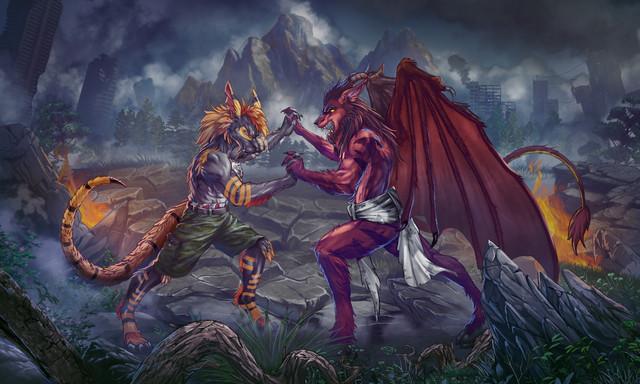 A piece for Rakuenwolf of FA! A friendly spar between Jaredin and Ifrit to test their strength, one dominant against another.Jaredin! What a good bean. Was an absolute pleasure to get to work with his big robot dragon guy again. And while I haven't played Final Fantasy 16 yet (i hope it comes to pc some day), I could not turn down a giant robot AND a giant beefy fire eikon at the same time. c: This one was a bit tough in spots, adding in some castle architecture and dealing with a whole lot of red, but I'm very pleased with where we landed!