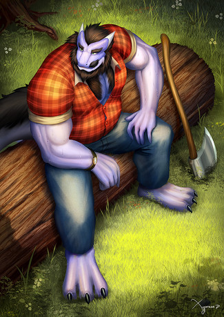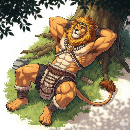 #anthro #axe #cat #charr #feline #fur #furry #lounge #lumberjack #nap #noai #rest #tree #guildwars2 #deriaz #talaran #taldren