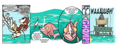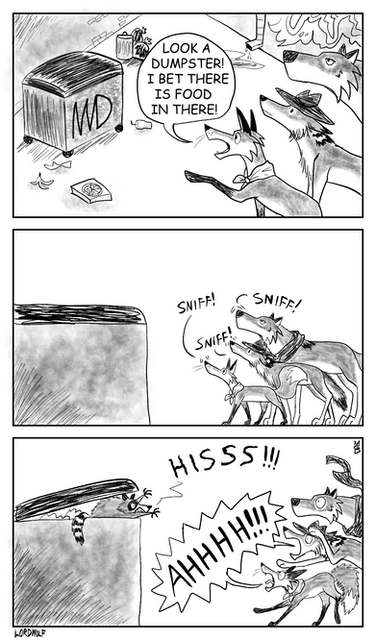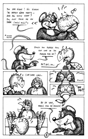 While not LITERALLY a "rabbit hole", this page was a fun one showing Sebastian reluctantly following Dachs down a hole in the rocks to a mysterious destination.Sebastian has not gained any dexterity in becoming a raccoon.