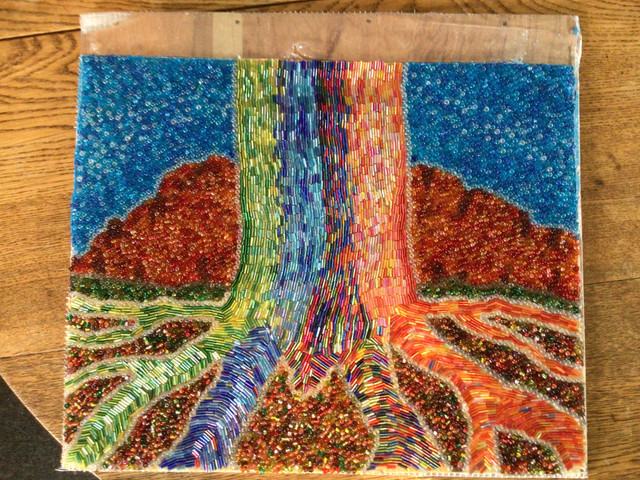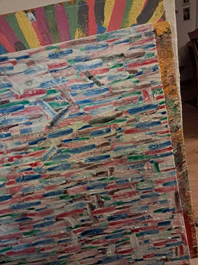 🤓 artificial intelligence’s Sunrise through tree122cm x 85cm, acrylic base, this will eventually be a Eucalyptus deglupta aka rainbow eucalypt, in Sunrise.