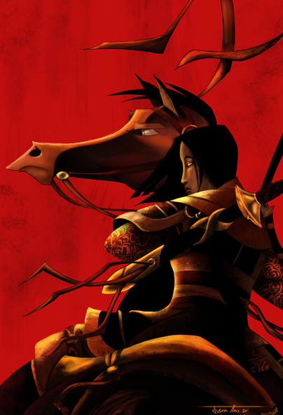 Mulan ain't no princess of a fairytale castle...she's so clearly suited to the battlefield. I like the armor, though at first I thought it was the tail end of a very heavy scarf blowing in a really strong wind. But yeah. And her facial expression is very good. I like the way you colored the lips, and the background is lovely. Not just plain red, which would bore the eye after a while.