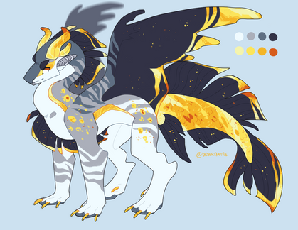 this is jay!hes a stuck up sky dragon who used to be tamed and served as a mount (hence saddle he cant reach to remove), but he ran away from his rider and almost went back bc he cant really hunt BUT he learned to steal other dragons food so hes doing fine lol