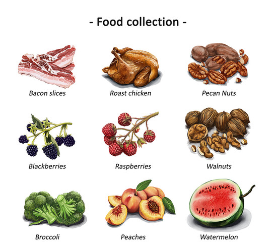 Your paintings are lovely. I don't have time for a full critique, but they are very nicely rendered and make the food look delicious as well as well designed. Especially the hazelnuts and the blueberries in this image.