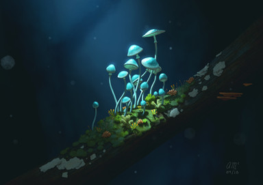 But anyway you make a beautiful painting ! The contrast between the dark brown of the light blue of the mushrooms enhances them and strengthens the impression that they're not of our world (in my opinion of course).