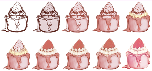I think there are many aspects to the process of drawing itself, and particularly to drawing food that one can learn about. I can't teach you in one go how to make nice looking food drawings. I need to show you some techniques and the logic you need to follow to get there. Sorry, I couldn't make things more compact, but I hope this still helps you improve your techniques.