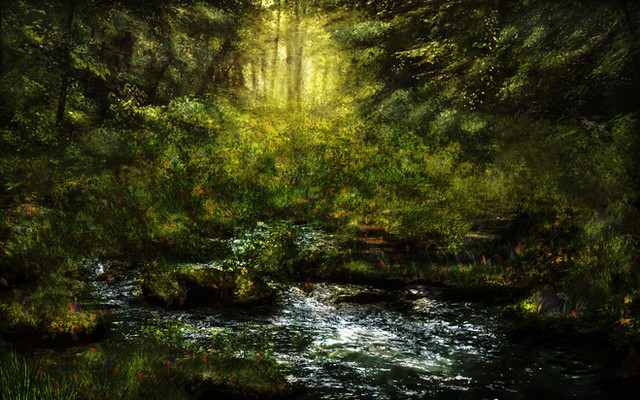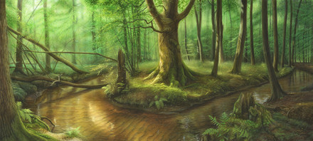 Long ago a tree fell across a small rocky forest stream creating a natural bridge. Little remains of the tree but a mossy, fungus covered, hollow log. Yet still it spans the meandering creek. Ferns and moss covered rocks line the banks of the water, and, just behind bridge, ivy attacks another old twisted oak. Perhaps this tree too will one day bridge the stream.I actually created this scene originally for my "Tiger on a Log" work ( daniel-eskridge.artistwebsites… ). But, I thought that it also made for a pretty good landscape scene on its own.